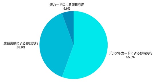 「デジタルカードによる即時発行」が55.5%で最も多かったが、「店頭受取による即日発行」も38.9%とこれに迫る勢いだった。なお、「仮カードによる即日利用」は5.6%であった。