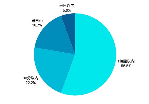 「1時間以内」が55.5%で過半数を上回った。また、「30分以内」が22.2%、「当日中」が16.7%でこれに続いた。なお、全体の75%以上は1時間以内にカード発行が完了していることがわかった。