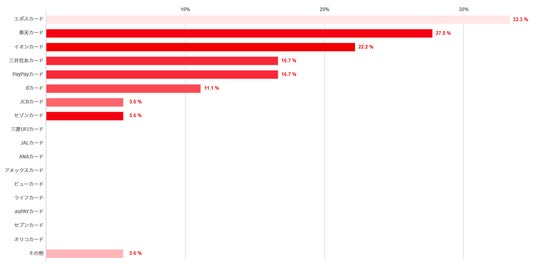 エポスカードが33.3%で最も多く、楽天カードが27.8%でこれに続いた。また、イオンカードも22.2%と多くの票が集まった。