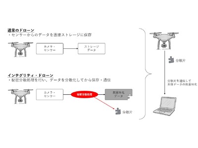 本実証試験では、市販のドローン機体に開発した秘密分散ソフトウェアを搭載し、飛行中のドローンを模したシステムを利用、撮影映像と制御コマンドをリアルタイムで分散処理することに成功しています。