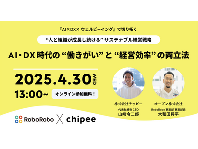 「こころとこころをつなぎ、世界を思いやりで満たす」をパーパスに掲げ、ウェルビーイング経営の実現を支援する株式会社チッピー(代表取締役:山崎令二郎)は、AI・DX活用で業務効率化を支援するオープン株式会社 RoboRobo事業部 事業部長の大和田将平氏と共催で、無料ウェビナー『AI・DX時代の “働きがい” と “経営効率” の両立法』を開催いたします。