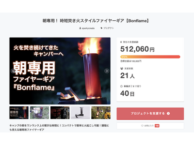 スパーキークリエイト株式会社(本社:北海道苫小牧市、代表取締役:成田 光 以下 スパーキークリエイト)は、2025年4月18日より国内クラウドファンディングサービス「CAMPFIRE」にて開催中の、当社オリジナルアウトドアブランドHigh Camp Go!!の、キャンプやアウトドアに最適なファイヤーギア『Bonflame』のプロジェクトにて目標金額を早期達成しました。