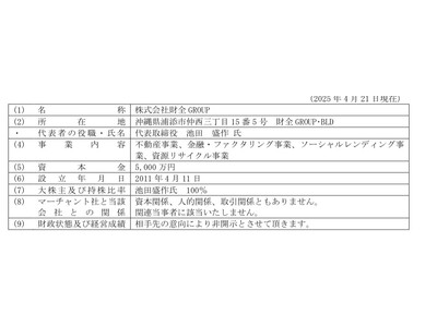 2025 年4 月21 日付で当社取締役会承認のうえ、同日付で、株式会社財全GROUP と業務提携契約 書を締結いたします。