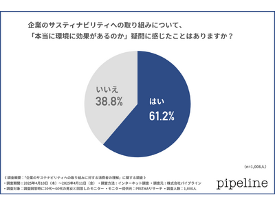 株式会社パイプライン(所在地:東京都中央区、代表取締役:石黒 文浩)は、20~60代の男女を対象に、「企業のサステナビリティへの取り組みに対する消費者の理解」に関する調査を実施しました。