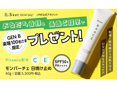 BiSketブースにてLINE公式アカウントをご登録いただいた先着100名様に、株式会社BiSketが展開するブランド「Mon BAACE(モンバーチェ)」のレギュラーサイズ日焼け止め『VITA CHARGE SUN BLOCK』(40g・税込3,300円相当)をプレゼントいたします。