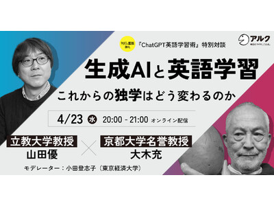 株式会社アルク(本社:東京都品川区、代表取締役:天野智之、以下「当社」)は、2025年4月23日(水)20:00~21:00に、特別オンラインセミナー「生成AIと英語学習 ~これからの独学はどう変わるのか~」を開催いたします。