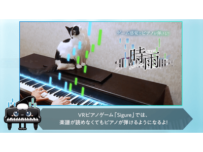 VRピアノゲーム「Sigure」では、VRゴーグルを使用することで、ピアノ上にノーツ(音の棒)を表示し、ゲーム感覚でピアノを弾くことができます。