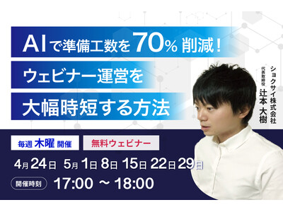 ショクサイ株式会社(代表取締役:辻本 大樹)4月24日(木)17時よりBtoBマーケティング担当者向けに「【法人担当者必見】AIで準備工数を70%削減!ウェビナー運営を大幅時短する方法」を開催いたします。