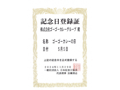 株式会社ゴーゴーカレーグループ(本社:石川県金沢市、CEO兼代表取締役社長:西畑誠)は、5月5日を「ゴーゴーカレーの日」として日本記念日協会に正式登録されたことをお知らせいたします。