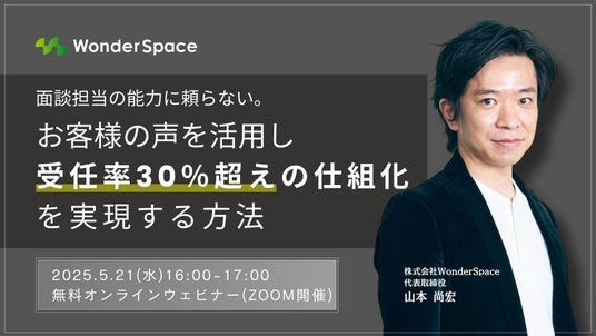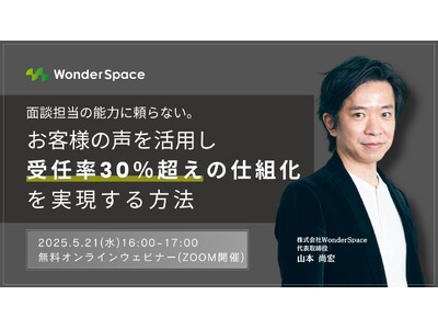 株式会社WonderSpace(本社:東京都港区、代表取締役社長:山本 尚宏)は『お客様の声を活用し「受任率30%超えの仕組化」を実現する方法』をテーマにウェビナーを開催します。