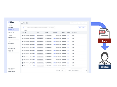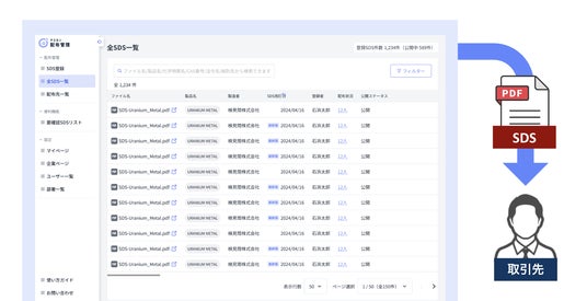 本サービスは、アップロードしたSDSを簡単かつ安全に取引先に配布できる機能を備えており、配布先や日時、配布状況などを一元管理できます。SDSの配布業務を効率化し、コンプライアンス強化を実現します。