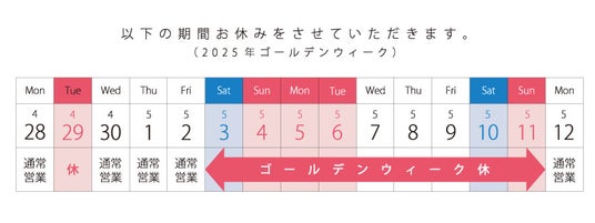 休業期間中にいただいたご注文・お問い合わせについては、5月12日(月)以降に順次対応させていただきます。休業日明けはご注文・お問い合わせの混雑により、通常よりも出荷・ご回答にお時間をいただく場合があります。