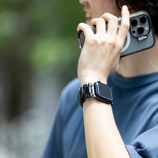 Apple WatchとApple Watch Ultraをよりタフに演出するスポーツカジュアルバンド。屈強なデザインが施されたチタニウムカラーとマットブラックのステンレス金具が、お手持ちのApple Watchをスタイリッシュにアップデートします。