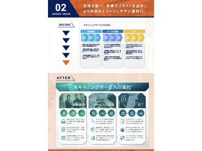 お客様がお手持ちのスライド資料または、スライド原稿を、キンコーズ・ジャパンの「デザインサービス」でリライト・制作します。お客様は完成品のイメージと原稿をご準備いただくだけで、視覚効果の高いスライド資料が完成します。