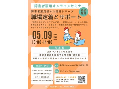 就労支援事業を行う株式会社manaby(本社:宮城県仙台市、代表取締役社長:岡崎 衛)は、企業向けオンラインセミナー「障害者雇用 基本の理解シリーズ 職場定着とサポート」を開催します。
