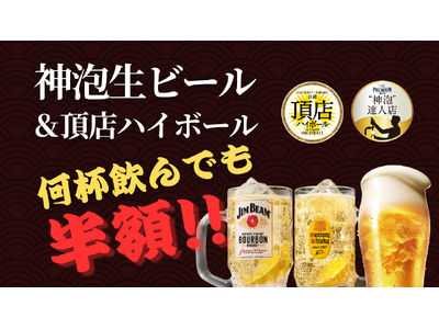 創作海鮮居酒屋「涛司(トウジ)」では、サントリー認定“神泡達人店”&“頂店ハイボール”のW称号獲得を記念し、ゴールデンウィーク期間限定で対象ドリンクが何杯飲んでも【半額】になるキャンペーンを開催中です
