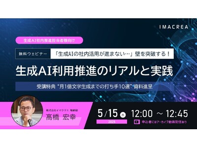 株式会社イマクリエ(本社:東京都港区 代表取締役:鈴木信吾、以下、当社)は、「生成AIを導入したものの、思ったように社内の活用が進まない…」とお悩みの生成AI社内推進担当者様へ向けたオンラインセミナー「生成AI推進のリアルと実践」を開催することをお知らせします。