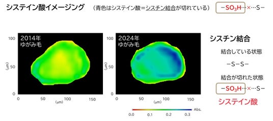 さらに、顕微赤外分光分析と多変量スペクトル分解を用いて、ジスルフィド結合が切れていることを反映する毛髪タンパク質のシステイン酸(SO3H)をイメージングしたところ、年齢を重ねたゆがみ毛はシステイン酸の増加がみられました(図3)。