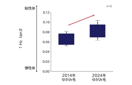 2014年当時に採取した35~44歳の女性5名の直毛とゆがみ毛、さらに左記5名の2024年に採取した直毛とゆがみ毛について一定の荷重と周波数の条件で動的粘弾性測定を実施し、弾性および粘性の性質の指標となるtanδを求めました。なお、tanδとは粘性の寄与を、弾性の寄与で割ったものであり、繊維材料の劣化評価などに使用されています。測定の結果、2014年採取のゆがみ毛よりも2024年に採取したゆがみ毛の方がtanδの値が上昇し、加齢による弾性率の低下が示唆されました(図1)。この物理特性の変化は、髪の体幹が弱くなっていることを反映しており、この変化によって、ゆがみ毛保有者は“気まぐれ髪”を実感しているものと考えられます。
