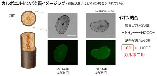 年齢を重ねたゆがみ毛の体幹が弱くなったのは、毛髪の構成成分において約80%を占めるタンパク質が一因であると考え、その中でも、髪を形づくる化学結合に着目しました。髪の化学結合は、例えば水素結合が知られており、この結合は水分によって結合が切れて髪の形状が変化してしまうことが知られています。本研究では、水素結合よりも強度が高い、イオン結合とジスルフィド結合に着目しました。イオン結合が切れていることを反映する、カルボニル化(CO)タンパク質をイメージングした結果、加齢によりゆがみ毛のカルボニルタンパク質が増加していることが確認できました(図2)。