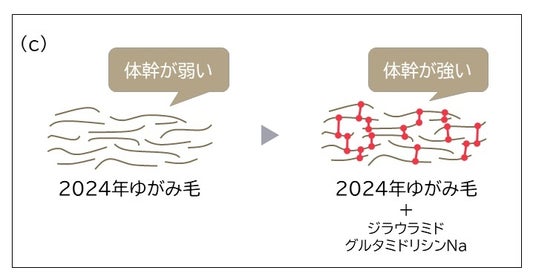 当社は、年齢を重ねて“気まぐれ髪”になってしまったゆがみ毛に、成分を内部に浸透させて毛髪内部の架橋密度を上げることにより、体幹の強い、美しい髪に導くことができないかと考えました。