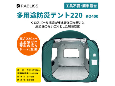 ドーム型構造で圧迫感のない広々個室空間を確保!RABLISS 多用途防災テント220 新発売のお知らせ