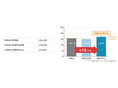 TERRACE(速読解力講座)を半年以上受講した生徒の平均点は、非受講生と比較して10点以上高い結果となりました。これは、全国平均点(126.67点)と比較しても+7.62点という結果で、長文読解や複数の情報を統合する問題において、トレーニングによって培われた情報処理能力と読解スピードが大きく影響したと考えられます。