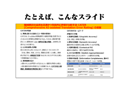 ErudAiteのファイル翻訳機能(α版)の1か所の編集も加えていないキャプチャ。タイトルのテキストボックスを拡張すれば、あとはそのまま利用可能なレイアウトで出力される。当然、文脈に基づく高精度かつ一貫性のある翻訳が行われている。