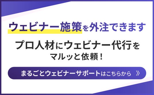 まるごとウェビナー サポートプラン企画・集客・運営・アフターフォローまでのウェビナー業務のすべてまるっと支援・代行するサービスです。ウェビナーからのリード獲得、顧客獲得にお困りの方はお気軽にご相談ください。