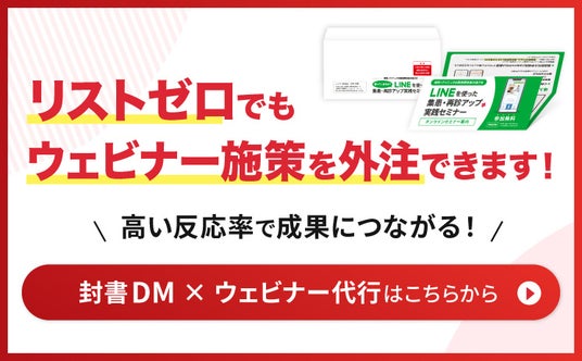 封書DMを活用したまるごとウェビナー サポートプラン封筒に入れたウェビナー案内チラシをターゲット企業に直接郵送し、ウェビナーへの参加を促進する新しいサービスです。従来のメールマガジンリストを活用しなくても見込み客に直接アプローチできるため、新規顧客開拓やリード獲得にお困りの方に最適です。