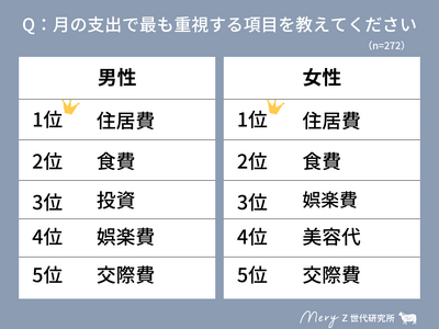 月の支出で最も重視する項目を伺ったところ、生活のインフラとも言える「住居費」「食費」が男女ともに上位となった一方、男性は3位に「投資」、女性は4位に「美容代」がランクインし、男女で違いが見られた。