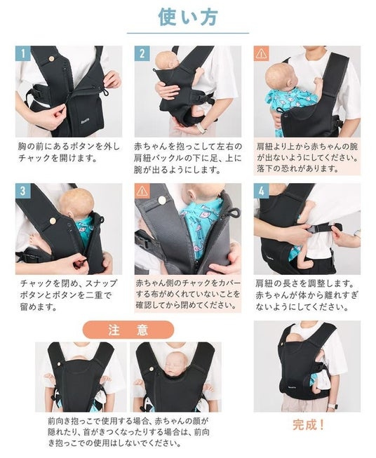 赤ちゃんを高く持ち上げなくても抱っこできるように前部が大きく開くフロントチャック仕様です。もちろんチャックは直接赤ちゃんの肌に当たらない仕様です。