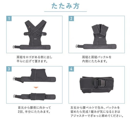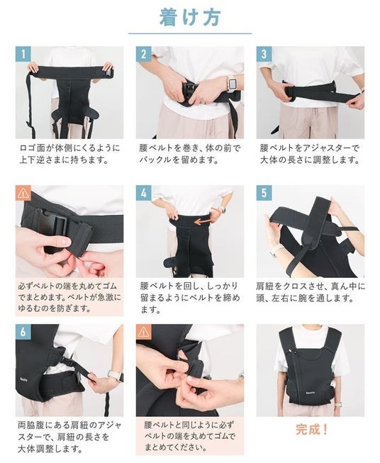 その際は必ずベルトの端を丸めてゴムでまとめてください。その後、腰ベルトを後ろに回してしっかりと留まるようにベルトを締めてください。