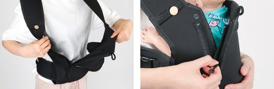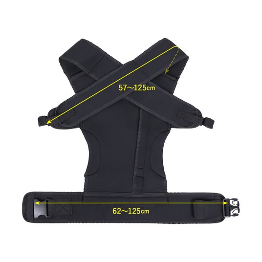 肩紐をクロスさせ真ん中に頭、左右に腕を通します。両脇腹にある肩紐アジャスターで肩紐の長さを調整します。腰ベルトと同じように必ずベルトの端を丸めて、ゴムでまとめてください。