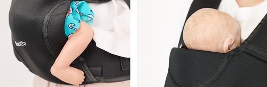 そこで着目したのがウェットスーツ素材です。水に強く、速乾性があり、軽量で伸縮性も抜群。まさに理想的な素材でした。この素材なら、赤ちゃんを優しく包み込みながら、水辺でも不安なく抱っこできる! Aqua Hugは、そんな新しい発想から生まれました。