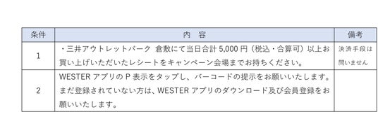 以下の条件をクリアした方に、抽選で全国の三井アウトレットパークにてご利用可能なお買物・お食事券もしくはWESTERポイント(基本)を当日プレゼントします。