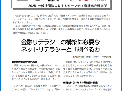 今回は、金融リテラシーを身につける上で大切な、「調べる力」「考える力」の必要性を論じた『金融リテラシーの構築に必要なネットリテラシーと「調べる力」』および当法人初の行政からの受託事業として、生活困窮者を対象とした相談窓口開設のご案内『家計相談から生活困窮者自立支援事業への飛躍!~八千代市とともに実現する福祉総合相談窓口のご紹介~』の二部構成となっております。是非ご一読ください。
