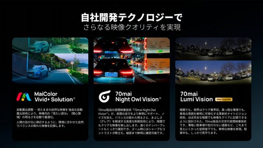 さらに、70mai独自の映像最適化技術「70mai MaiColor Vivid+ Solution」により、照明環境に応じた自動調整が可能。夜間映像も「70mai Night Owl Vision」によるノイズ軽減や、「70mai Lumi Vision」の暗所強化機能によって、深夜の走行中や駐車中でも安心の高画質を実現しました。