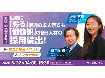 株式会社トレンド・プロ(本社:東京都港区、代表取締役社長:岡崎寛之、以下トレンド・プロ)は、医療・介護業界に特化した採用/定着化コンサルタントの巳年後徹氏と共同で、採用コストを削減しつつ、人材の定着を図る独立型採用メソッドとマンガの活用術を解説するオンラインセミナーを5/22(木)14時から開催いたします。