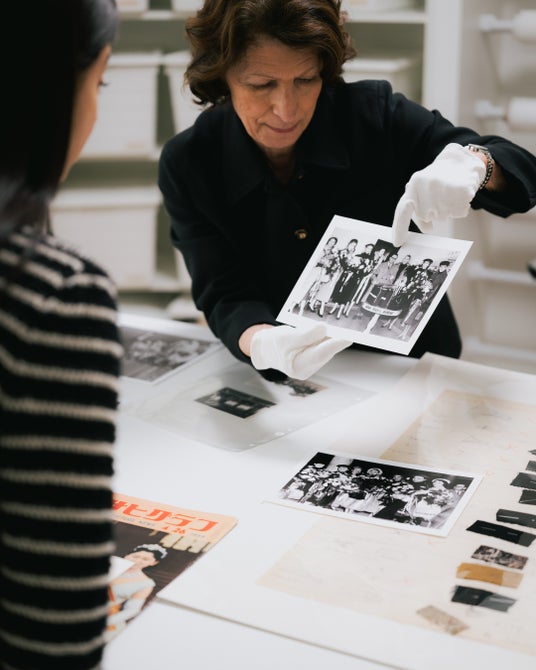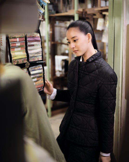 新木優子は、1894年に京都で創業した歴史ある絹織物工房、龍村美術織物とクリスチャン・ディオールが1954年から築き、発展させてきたコラボレーションのアーカイブをパリのヘリテージで学びました。そして、京都にある龍村織物の工房で2025年フォール コレクションのために特別に手織りされた生地の制作工程を実際に体験し、ショー会場に向かいます。
