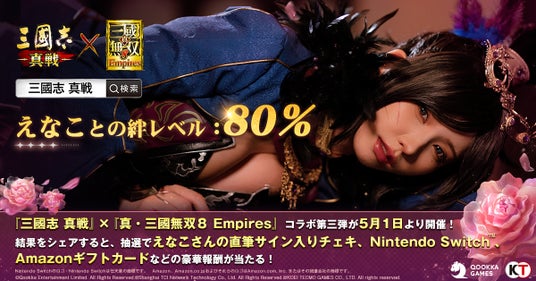 5月1日、えなこさんのコラボ開催告知動画の公開と共に、『三國志 真戦』の公式Xでリポストキャンペーンも開催します。RPするとえなこさんのサインチェキ、Amazonギフトカードなどの報酬を獲得できるチャンスがあります。