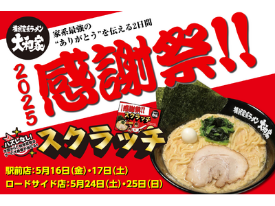 「2025感謝祭」では各店舗にて麺類をご注文いただいたお客様全員にハズレ無しのスクラッチくじを進呈。感謝祭限定デザインの大和家オリジナルグッズ、ラーメンやトッピング無料券がもれなくその場で当たります。