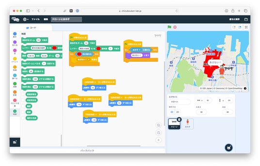 ビジュアルプログラミング- - 地図を表示 → キャラクターや物を配置 → Scratchの互換ブロックでプログラミングできる