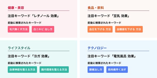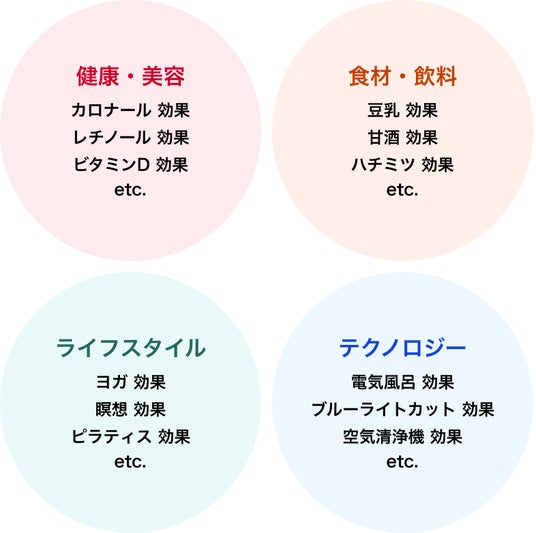 「Yahoo!検索」で検索された「効果」を含むキーワード上位2,000件を、AIを活用してカテゴリ分けしたところ、「健康・美容」「食材・飲料」「ライフスタイル」「テクノロジー」の4つに分類されました。「健康・美容」カテゴリではカロナールなどの薬品の他、レチノールやビタミンDといった美容目的でよく活用される成分が、「食材・飲料」は豆乳や甘酒、ハチミツなどの食品が、「ライフスタイル」ではヨガや瞑想、「テクノロジー」はブルーライトカットや空気清浄機などが「効果」とともに検索されていました。