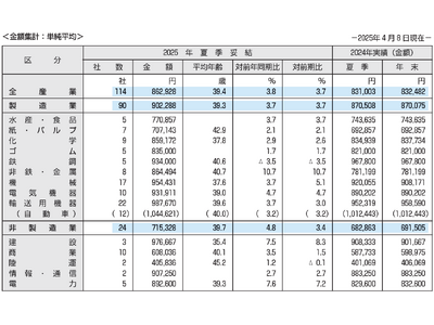 民間調査機関の一般財団法人 労務行政研究所(理事長:猪股 宏)では、東証プライム上場企業を対象に、今年の賃上げと同時期に交渉・妥結した夏季賞与・一時金について調査し、支給水準は114社、支給月数は115社の結果を集計した(2025年4月8日現在)。