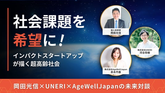 株式会社AgeWellJapan代表取締役 赤木円香氏、個人投資家 岡田光信氏、株式会社UNERI代表取締役CEO / UNERI Capital代表パートナー河合将樹による対談記事《「社会課題を希望に!」インパクトスタートアップが描く超高齢社会 ~岡田光信× UNERI × AgeWellJapanの未来対談 ~》がAgeWellJapanのWebページから公開されました。