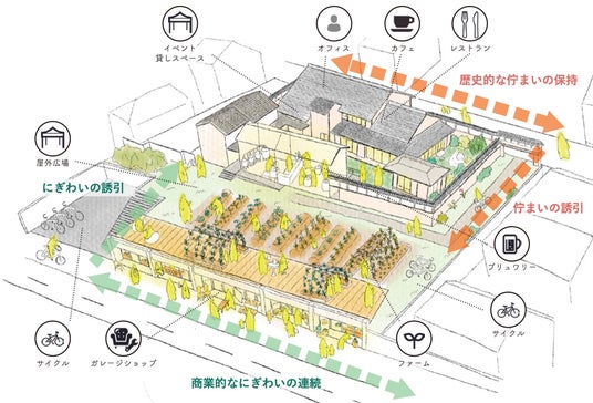 施設構成(予定):レストラン、カフェ、物販、ブリュワリー、農園などの複合型