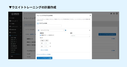 ウエイトトレーニングの計画作成時には、セットごとの重さと回数を細かく設定することができるようになりました。作成した単体のトレーニングメニューは保存でき、複数組み合わせたトレーニングプログラムを簡単に作成できるようになりました。