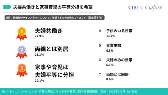結婚後の理想のライフスタイルについては、「夫婦共働き(27.9%)」「(両親or義両親と)別居(23.1%)」「家事や育児は夫婦平等に分担(22.1%)」が上位に並びました。特に共働きと家事育児の平等分担を希望する声が多く、経済的な安定だけでなく、パートナーシップとしてのバランスを重視する価値観がうかがえます。また、親との同居よりも「別居」を選ぶ回答が多かったことから、程よい距離感を保ちながら自立した家庭を築きたいという傾向も見られました。