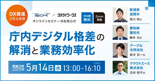 一般社団法人自治体DX推進協議会(以下、GDX)は、株式会社マイナビ(マイナビニュースTECH+)および株式会社ジチタイワークスが共同開催するオンラインセミナー「庁内デジタル格差の解消と業務効率化」(2025年5月14日開催)に協力いたします。